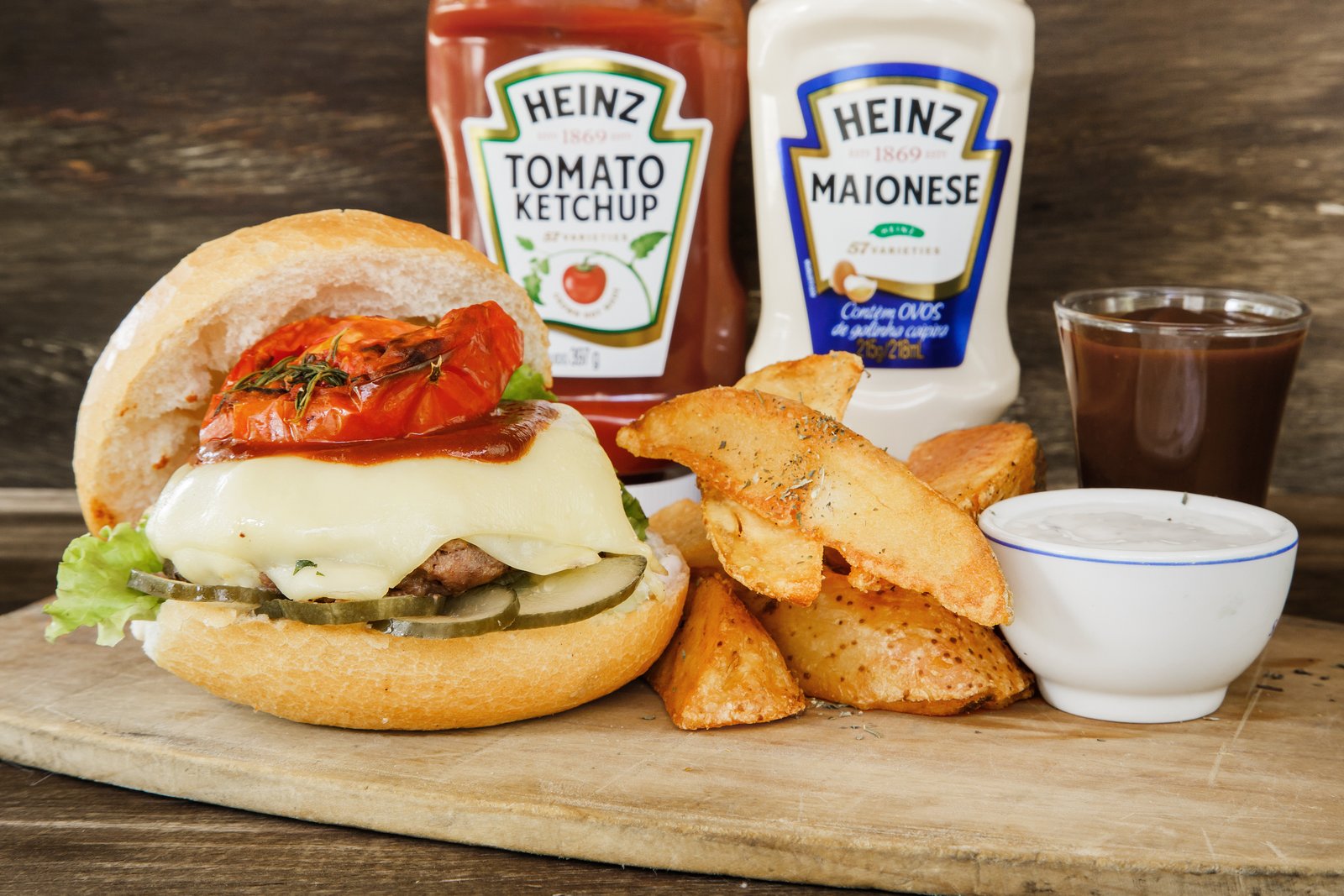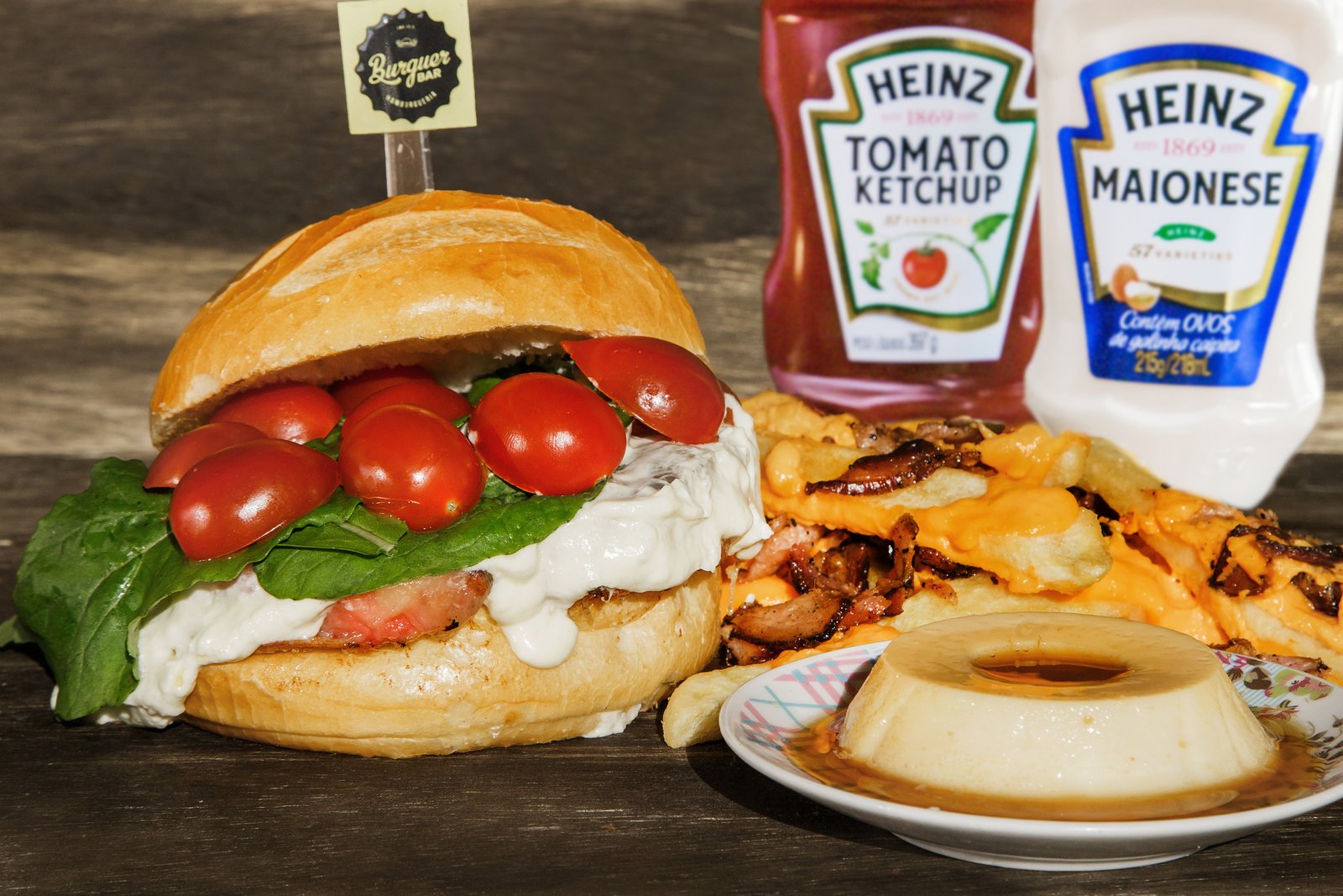 - Os Incríveis: Pão d’água, hambúrguer de linguiça artesanal, maionese especial da casa, bacon, creme três queijos (cream cheese, muçarela e provolone), rúcula e tomate. Acompanha batata especial com cheddar e bacon e mini pudim de leite condensado.