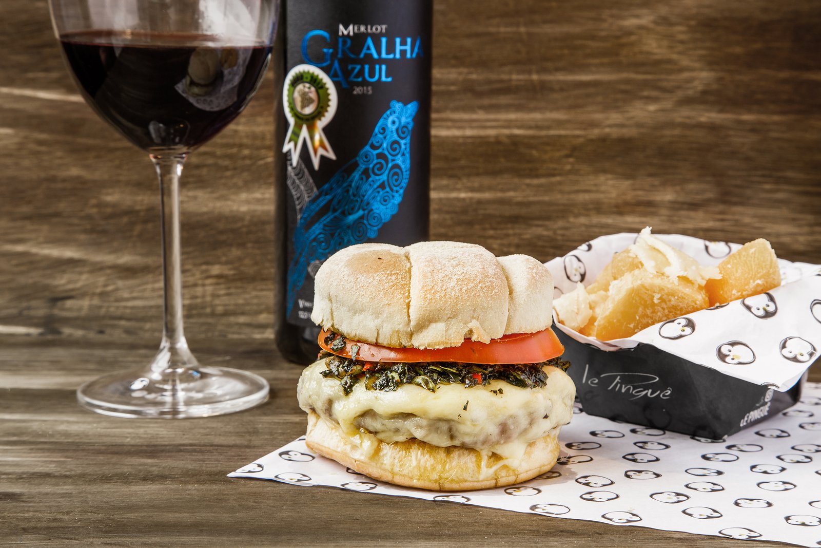 - Opção 1 – Cordeiro Gralha Azul: Pão crocante, hambúrguer de 190g de cordeiro, queijo muçarela, tomate, molho de hortelã e maionese da casa. Acompanha mandioquinha frita com lascas de parmesão e uma dose de vinho merlot.