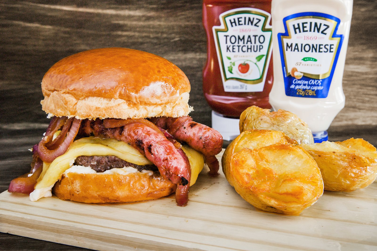 - Opção 1 – John Bowen: Pão brioche, hambúrguer bovino, maionese caseira, queijo muçarela, queijo prato, linguiça bizinelli e cebola defumada. Acompanha batata frita caseira.