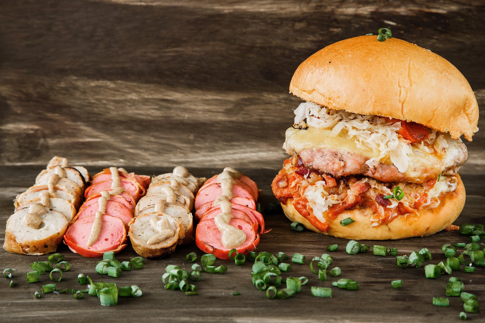 - Opção 1 – Deutsche Burgund Rep: Dois hambúrgueres suínos 120g, molho vermelho com curry, queijo muçarela, sauerkraut (chucrute), maionese da casa, servido no pão artesanal da casa. Acompanha bockwurst ou bratwurst com mostarda escura.