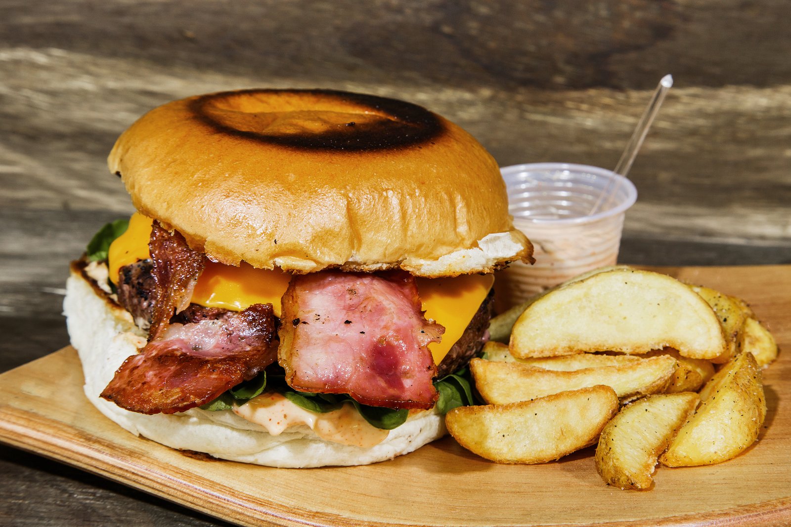 - Chuck Norris: Pão de brioche, hambúrguer de costela 170g, alface lisa, tomate, cebola roxa, queijo cheddar, bacon grelhado, maionese caseira e hot sauce. Acompanha mandioca frita.